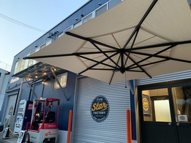 ニッツクの玄関前に、パラソル付きの休憩スペースが完成しました!