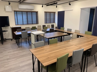 広く明るいスペースで、天井のオシャレなライトがカジュアルな現場を演出しています。
