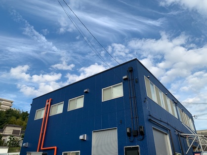 【『ミナミの帝王』の序盤に登場しそう。建物は経年劣化によるサビで迷彩柄。見るからに暗くて営業実態が不明。段ボールや機材で雑然としている。腕サックをつけた年配の作業員がいる。】