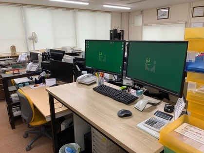 デスクのPCモニターは二台取り付けられていて、どのような業務で使われるものなのか今の私には想像もつきませんでしたが、いかにも最先端な雰囲気がありありです。